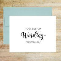 INCLUDES: A2 size folded card (4.25 x 5.5 in.). Digital flat printed on 110lb matte white card stock in Black ink with FONTS SHOWN in sample. Blank inside with your color choice of blank A2 size envelope.